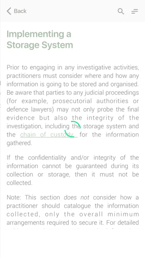 The Global Rights Compliance (GRC) Basic Investigative Standards App, places key principles and international standards for collecting, preserving and handling evidence relating to violations of international humanitarian and human rights laws in an easily accessible format for use by professional and non-professional investigators alike.