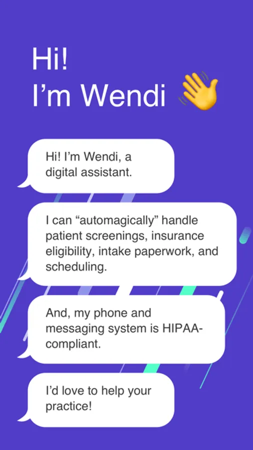 Wendi is the first benefits-aware omnichannel digital assistant designed specifically for healthcare professionals. Wendi can interact with prospective and active patients through web chat, phone (VoIP), and SMS to “automagically” screen new patient inquiries, instantly check insurance benefits, automate intake paperwork, and schedule appointments. Oh! And of course it’s HIPAA compliant.