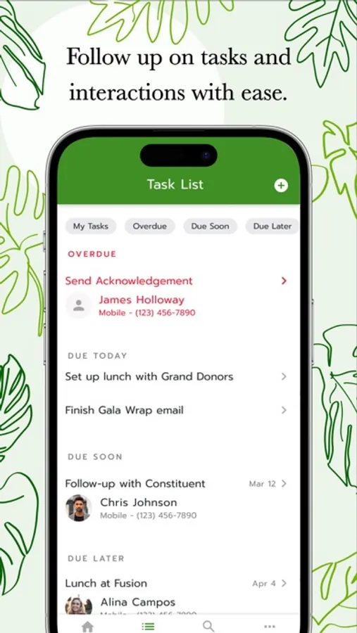 First Time Donors -- Never miss a new donor. With the iOS app, you can call first time donors directly from the Suggested Task List or assign the task to another member of your team.