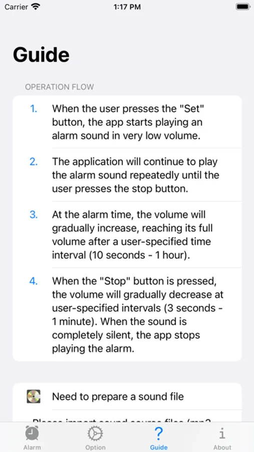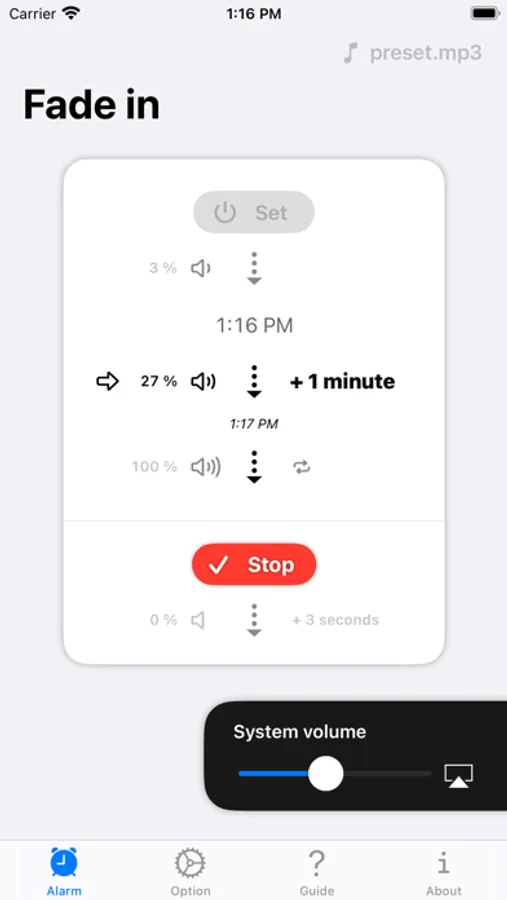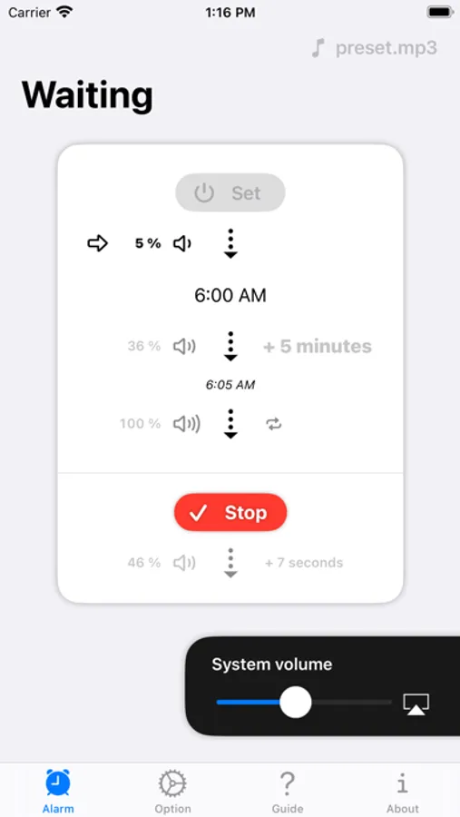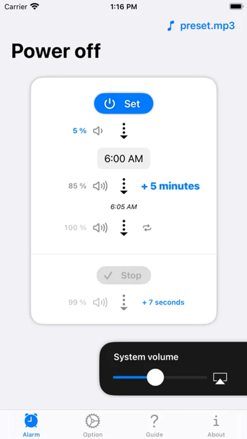 任意の時刻になるとゆったりと少しずつ音量が大きくなるアラームアプリ。