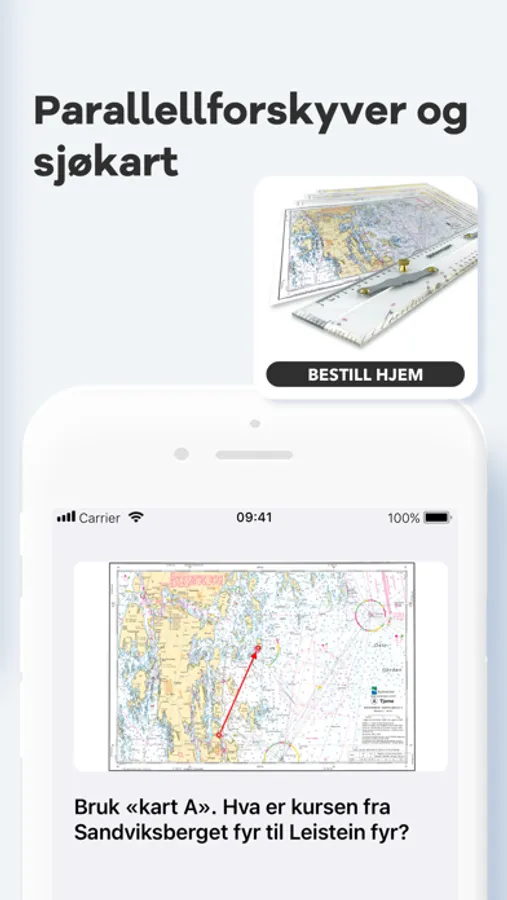 Kan bestilles i appen. Videokurset lærer deg hvordan du bruker dette, og du kan øve på oppgaver like dem på båtførerprøven.