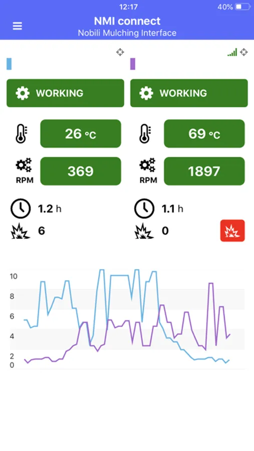 Thanks to NMI Connect, it is possible to quickly assess the status of the machine using the specific indicators. By keeping the Bluetooth connection and the application active, the monitoring continues also in background, notifying the operator of any malfunctions or anomalies. Through visual and audible alarms, it limits the inadequate use of the machine and notifies the user of ordinary and extraordinary maintenance.