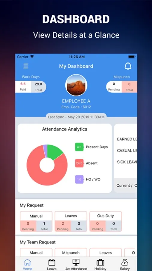 1. Dashboard presenting Attendance and Leave Analytics and many more.