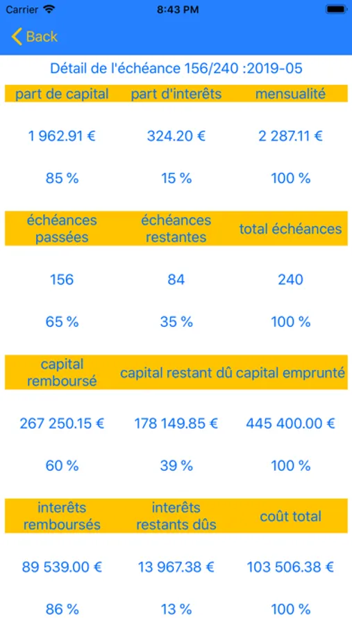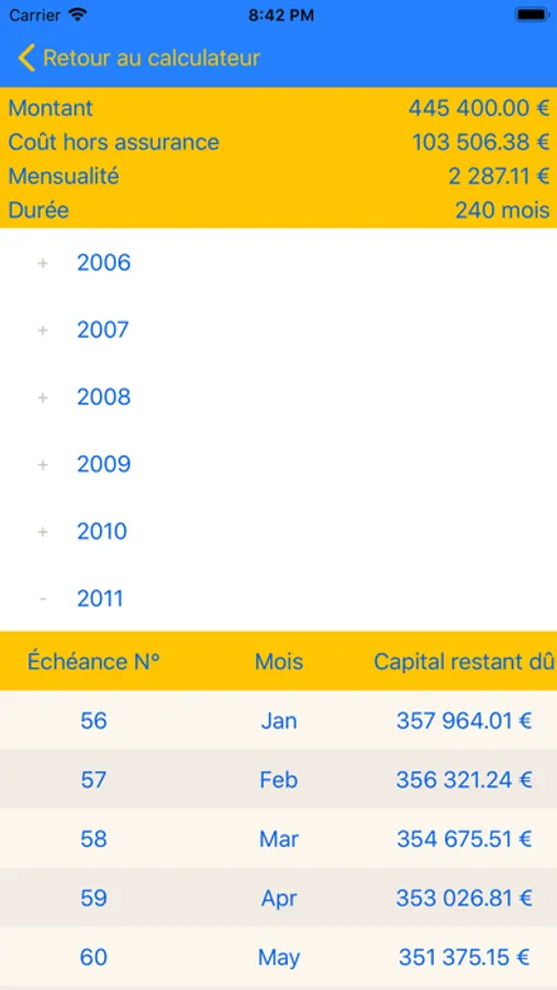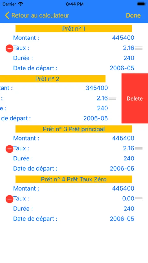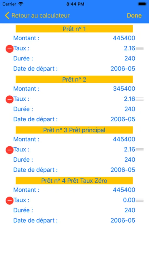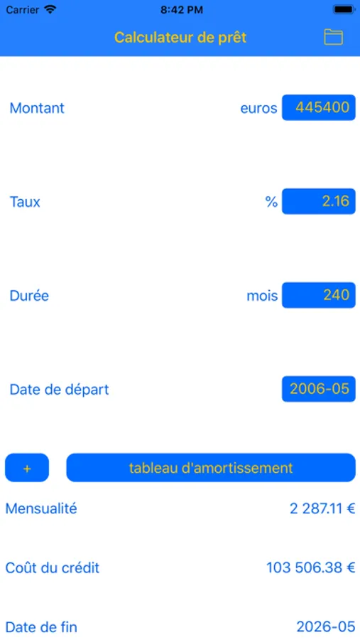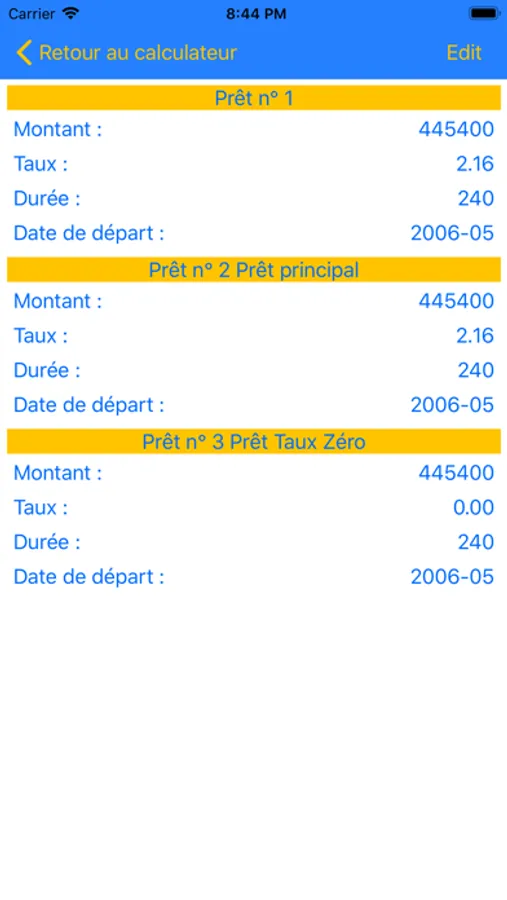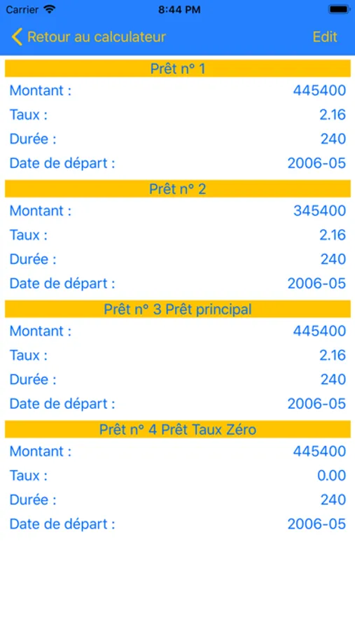 - Sauvegarde des caractéristiques du prêt (montant, durée, taux, date de départ)