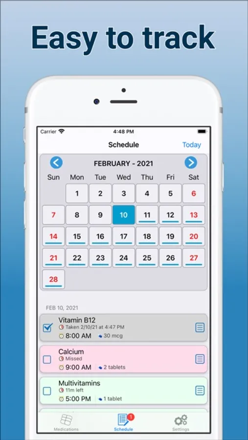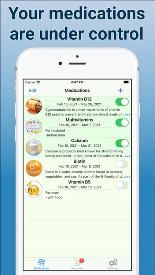 Just customize the app to your needs and it will remind you of what medicine and when You need to take it.