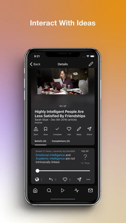 Mark books, films, podcasts and articles complete to build out a model of what informs your beliefs. Or use Dimenschen while you consume your favorite podcast, creating and rating beliefs as you listen.