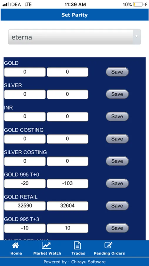 The "Set Parity" module will allow you to set the buy and sell parity of each scrip. You can select the template on the top and then set the buy and sell parity of each scrip and press save button to update on their respective website. The template list is on the top where you can have multiple templates to categorize your customers. Each customer will see rates depending upon the template he is set into.