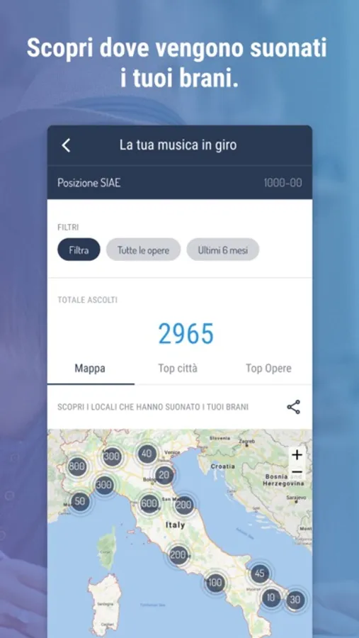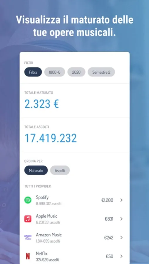 • Visualizza la performance dei tuoi brani, scopri i trend dei tuoi guadagni e consulta il dettaglio relativo alle principali piattaforme digitali