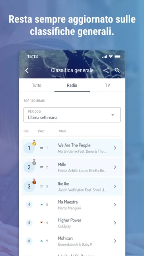• Trova i tuoi brani nelle classifiche Radio e TV e condividi la posizione sui tuoi profili social