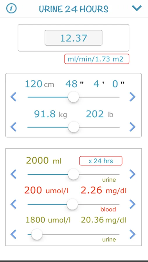 A calculator is also provided for creatinine clairance calculation for 12 & 24 urine collection sample.
