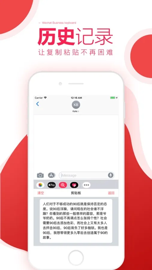 5.「微商键盘」内置了剪贴板历史记录列表,您可以点击任意一条进行同样的输入操作。