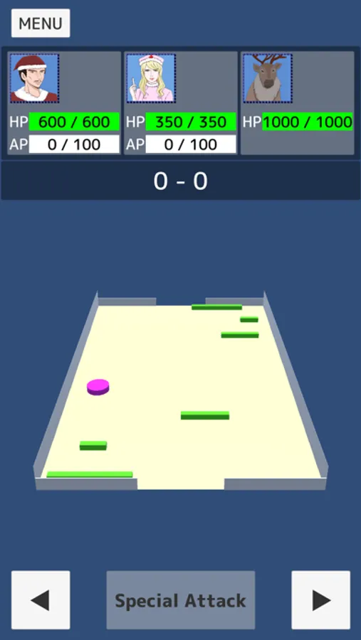 みなさんは,サンタさんがクリスマス以外は何をして過ごしていると思いますか?長年にわたる調査の結果,私達はエアーホッケーをしていることを突き止めました.そのエアーホッケーは,普通の人間たちがプレイしているものとは全然違ったものでした.私達はサンタさんがプレイしている珍しいエアーホッケーをゲームで再現することにしました.