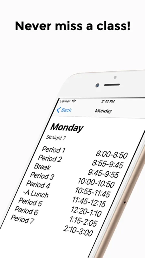 - The entire bell schedule is visible from one click inside the app and allows you to see when the next class is.