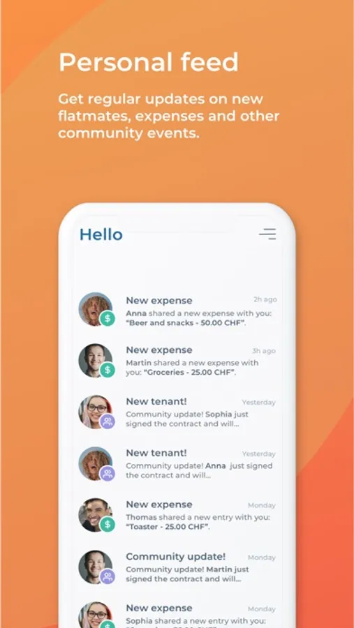 Our app is the best way to keep track of the latest events at home and within the Room Estate community. Get updates on new flatmates, moving ins and outs and many other happenings.