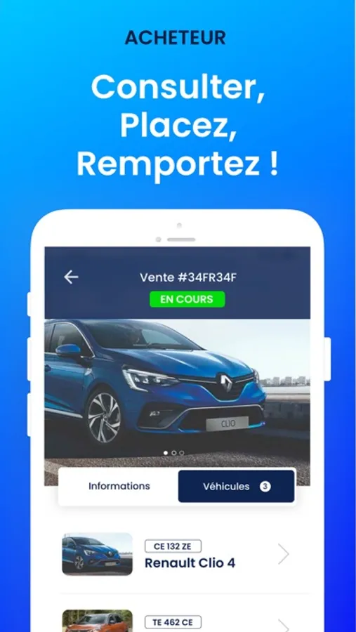 - Vendez des véhicules d’occasion OU placez des offres (selon votre profil utilisateur) pour les lots qui vous intéressent ;