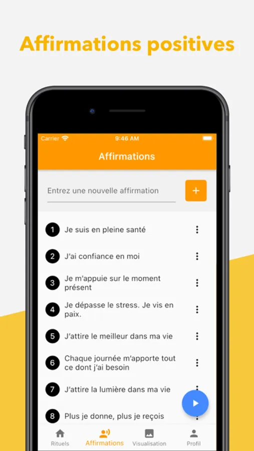 • AFFIRMATIONS - Chaque jour, en fonction des défis que vous devez affronter, vous pouvez ajouter ou supprimer des affirmations positives qui vous donneront la force et le courage de passer à l'action.