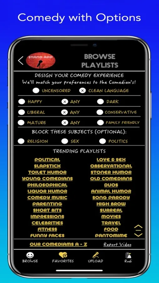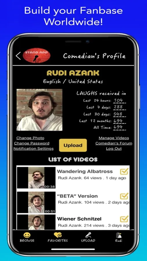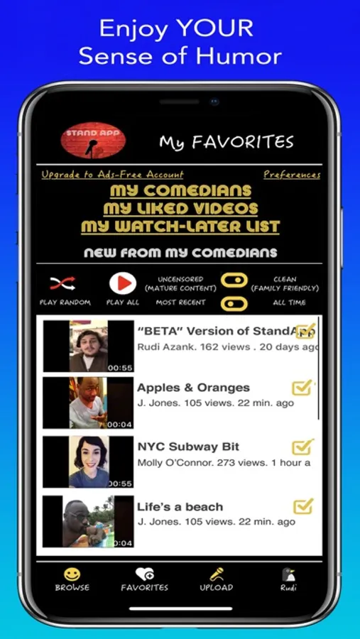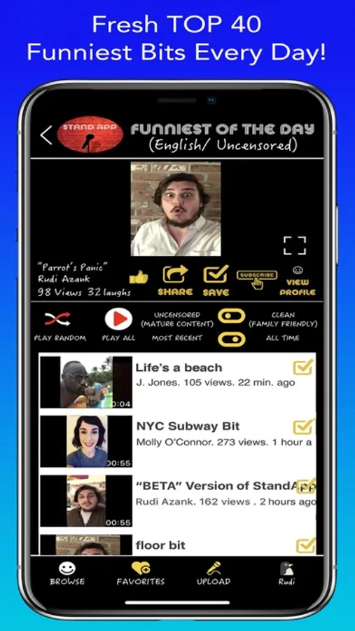 Your own personal comedy club right in your pocket! Stand-App Open Mic matches comedians worldwide with their ideal audience, thru filters and preferences. Viewers enjoy FREE & UNLIMITED Stand-Up Comedy Clips from new comedians around the world. Fresh clips posted every minute to our Comedy Playlists, in order of their “funny-ness”.
