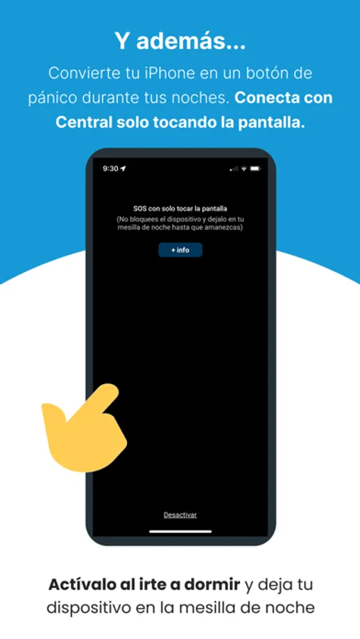 Y ademas... podrás convertir tu iPhone en un "Botón de Pánico" nocturno. Deja tu dispositivo en la mesilla de noche y ante cualquier emergencia en el hogar podrás conectar con nuestra Central 24/7 con solo tocar la pantalla.
