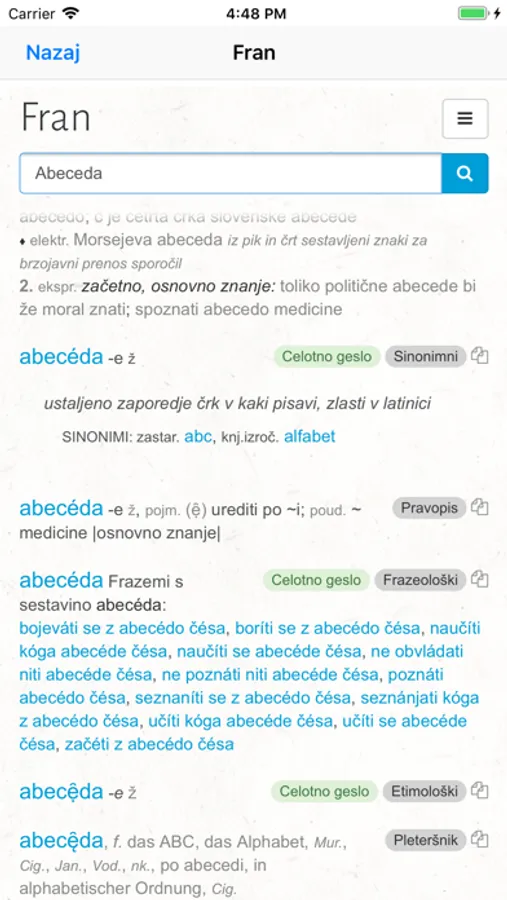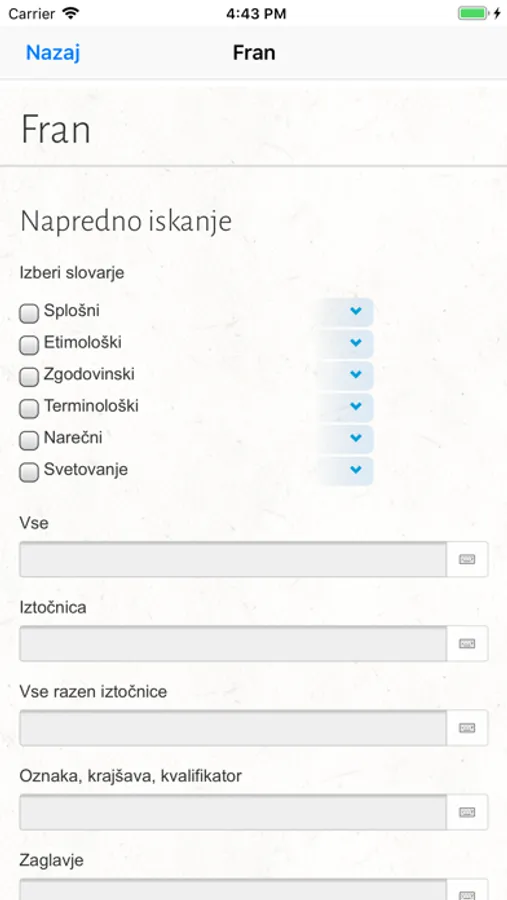 Searching through Fran is quick, simple and free. You can search through all dictionaries at the same time or choose specific dictionaries and search through them.