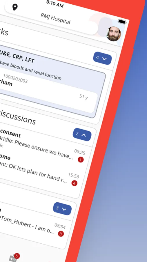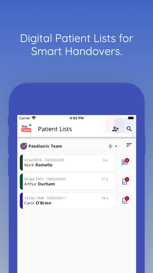 With simple and intuitive design, onboard your team or entire organisation seamlessly to search anyone by their role and instantly message them with patient-centric chat. Keep up to date with all your patients through real-time lists and become a ‘bleep-free’ hospital with digital handovers and smart clinical task management.