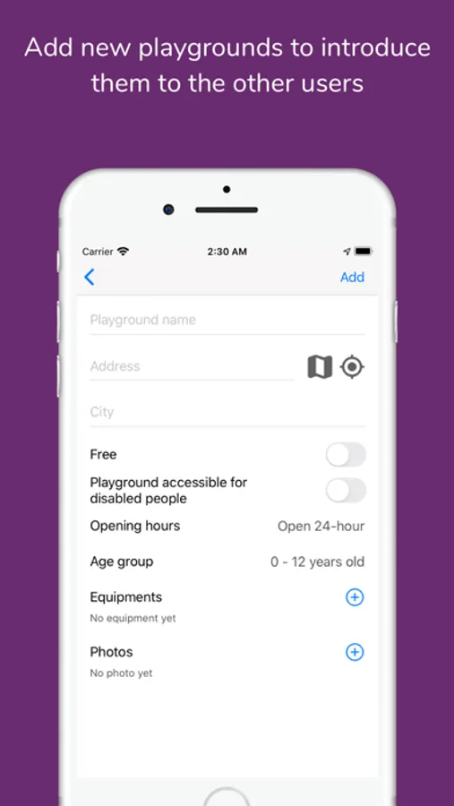 If you know or notice a playground that is not yet on the map, add it so that the other users can discover it too and enjoy with their kids.