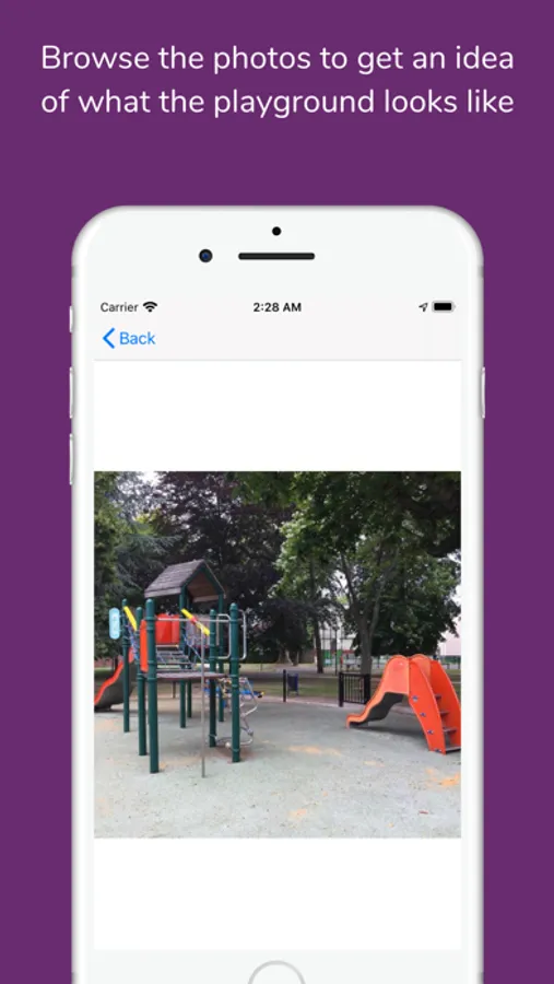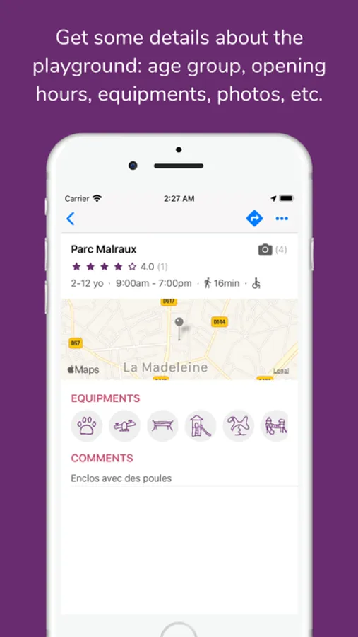 Playgroond helps you discover the playgrounds around you. The app locates you on a map and then displays playgrounds surrounding you and the walking time to go to each of them. Detailed information give you the age group, opening hours, equipments, rate, photos, etc.