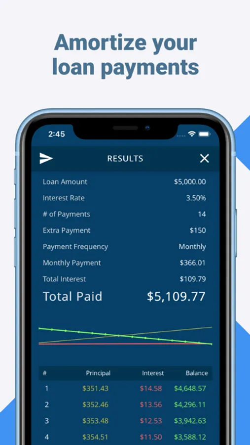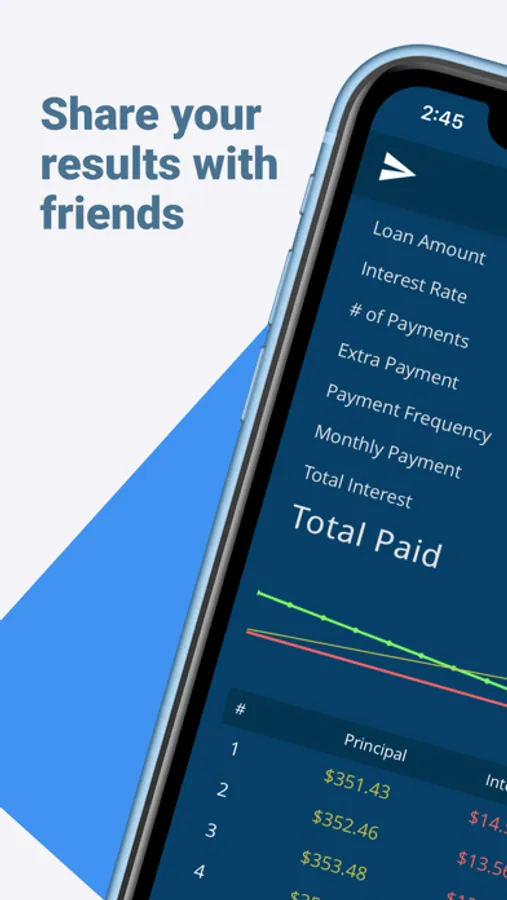 Set the loan amount, interest rate, terms, extra payments (optional), and payment frequency (set monthly by default), then tap on “calculate” and get the monthly payment, total interest paid, total paid with interests, and the amortization schedule. You can then share the loan terms via email, SMS, or your preferred social network with family and friends.
