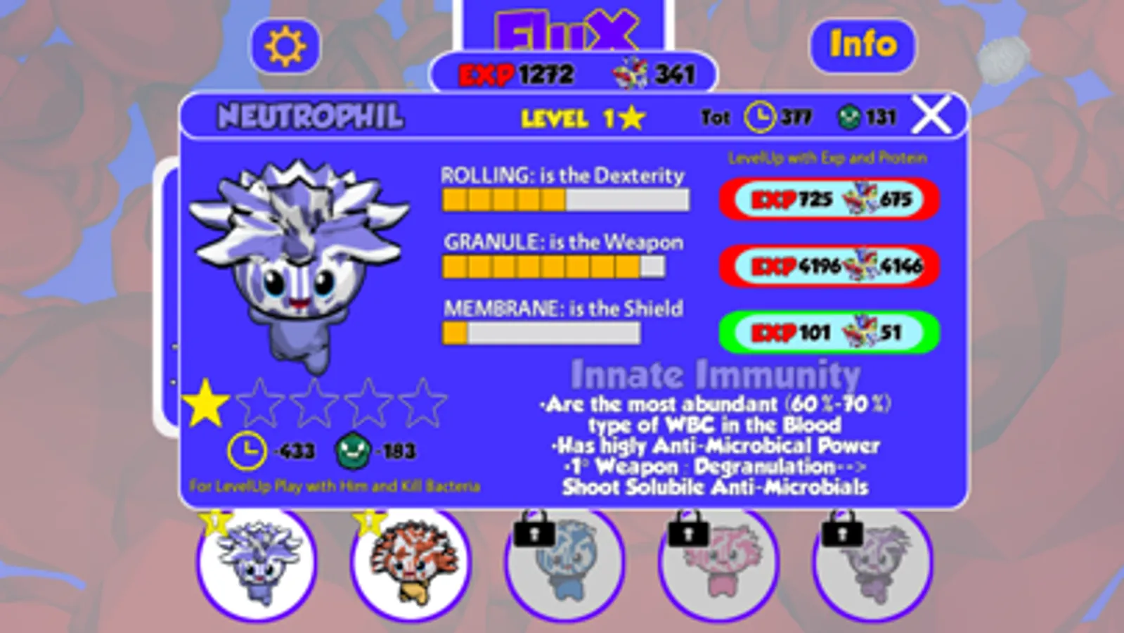 Your Champions have different characteristic, you will be able to improve them by defeating the Bacteria and collecting protein.