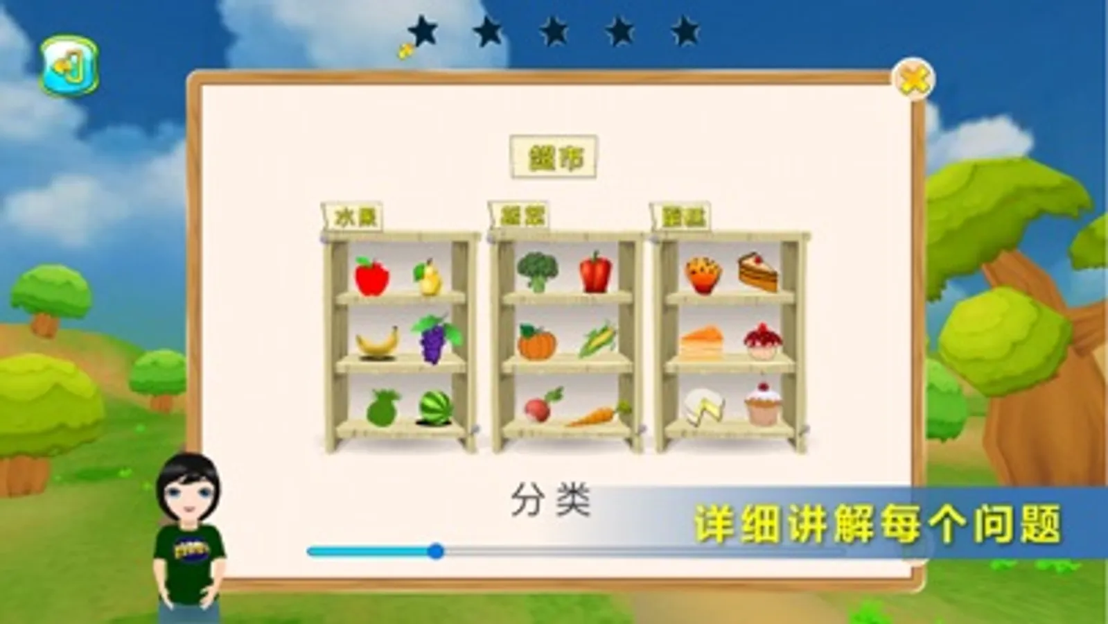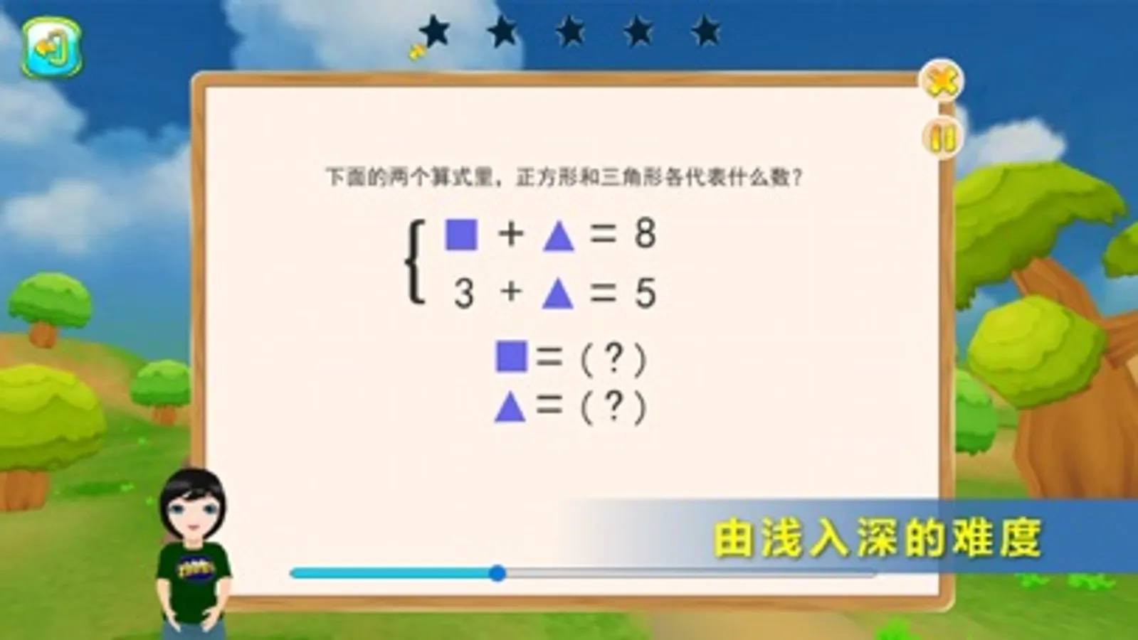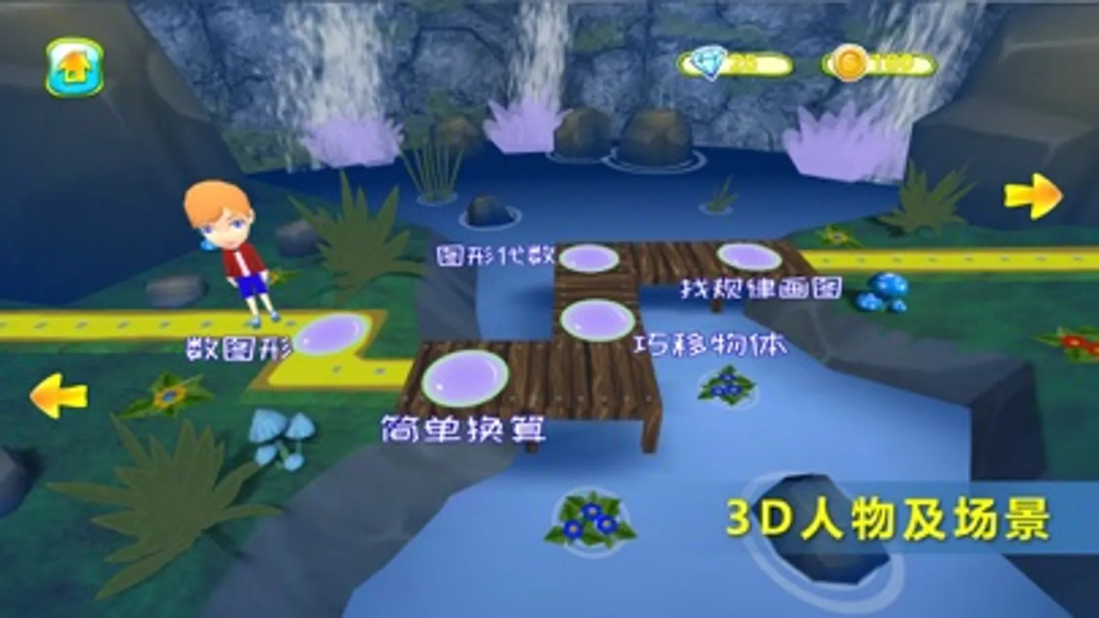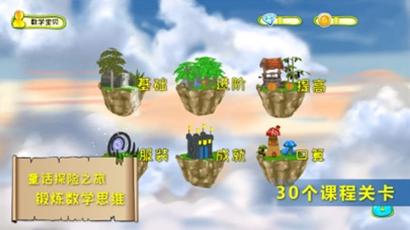 30个课程关卡包括:简单分类、比一比、认识图形(一)、几和第几、认识图形(二)、数图形、简单换算、巧移物体、图形代数、找规律画图、找规律填数、方向和位置、变与不变、加加减减、可能性、认识时钟、多1少1、练练观察力、数小正方体、趣味问题、长度单位、数位和竖式、比较大小、奇数和偶数、简单推理、钟面上的数学、进位和退位、速算和巧算、简单的排列、竖式迷题。