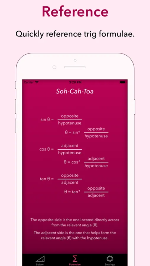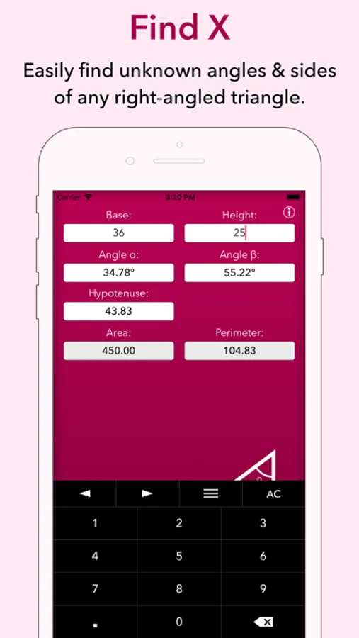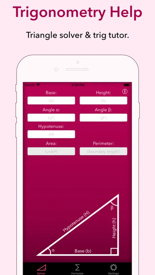 Trig Help is a simple triangle calculator that enables you to quickly and easily find unknown angles & sides of any right-angled triangle.