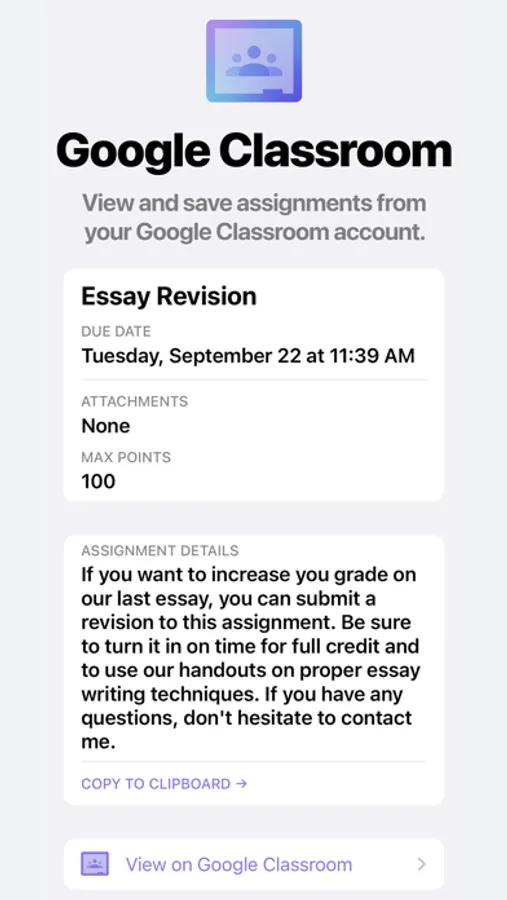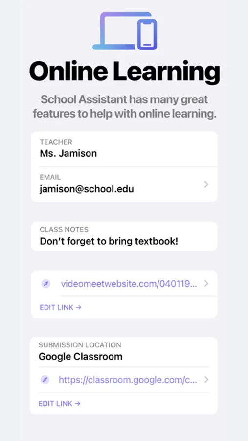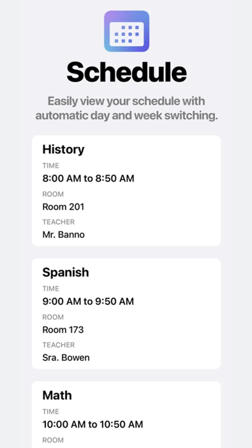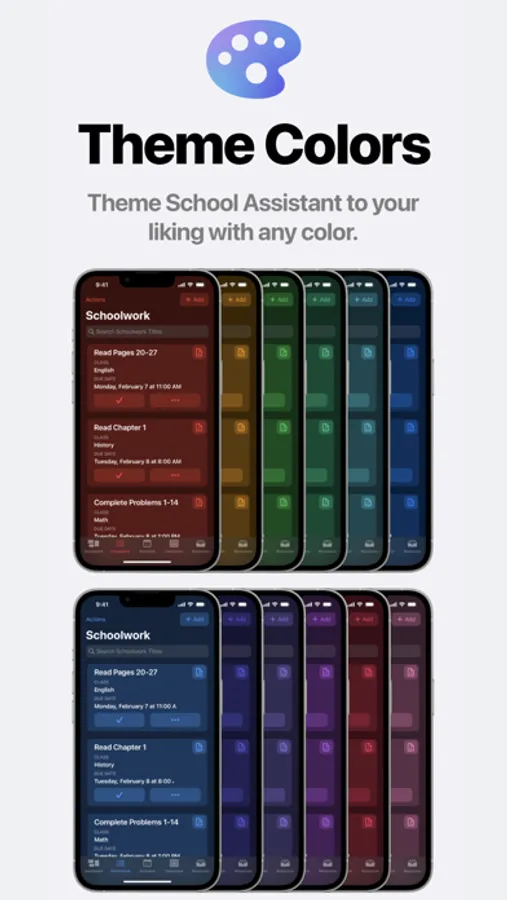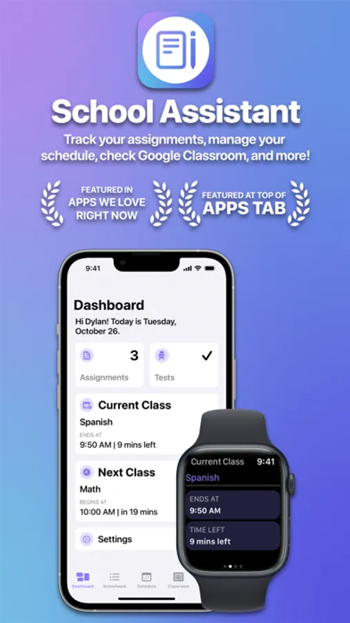 First, as a student myself, I fully believe it is wrong to charge students money for trying to succeed in school. So, School Assistant is completely free, and will forever be free. No premium subscriptions, no paywalls, and no ads. Ever. If you like the app, it would be amazing if you considered donating through the Tip Jar in Settings (this is why the App Store shows that there are In-App Purchases).