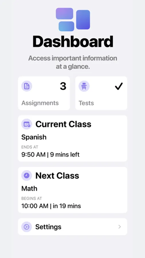 - See your current class and next class on the Dashboard and with Home Screen Widgets