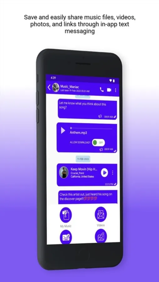 The sayeYO app provides an opportunity for music artists to securely store their song and video files in one place and easily share their songs, photos, and videos through fully encrypted in-app text messaging or through external communications platforms like email or social media.