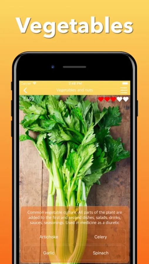 This is a great educational game for everyone. Guess fruits and vegetables! Test your knowledge!
