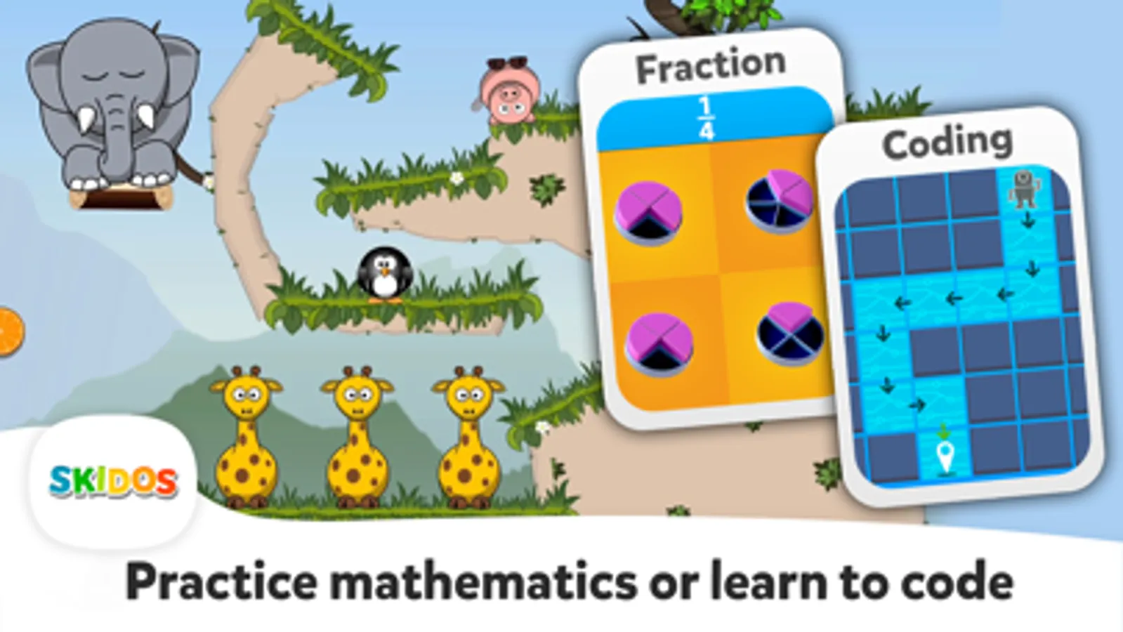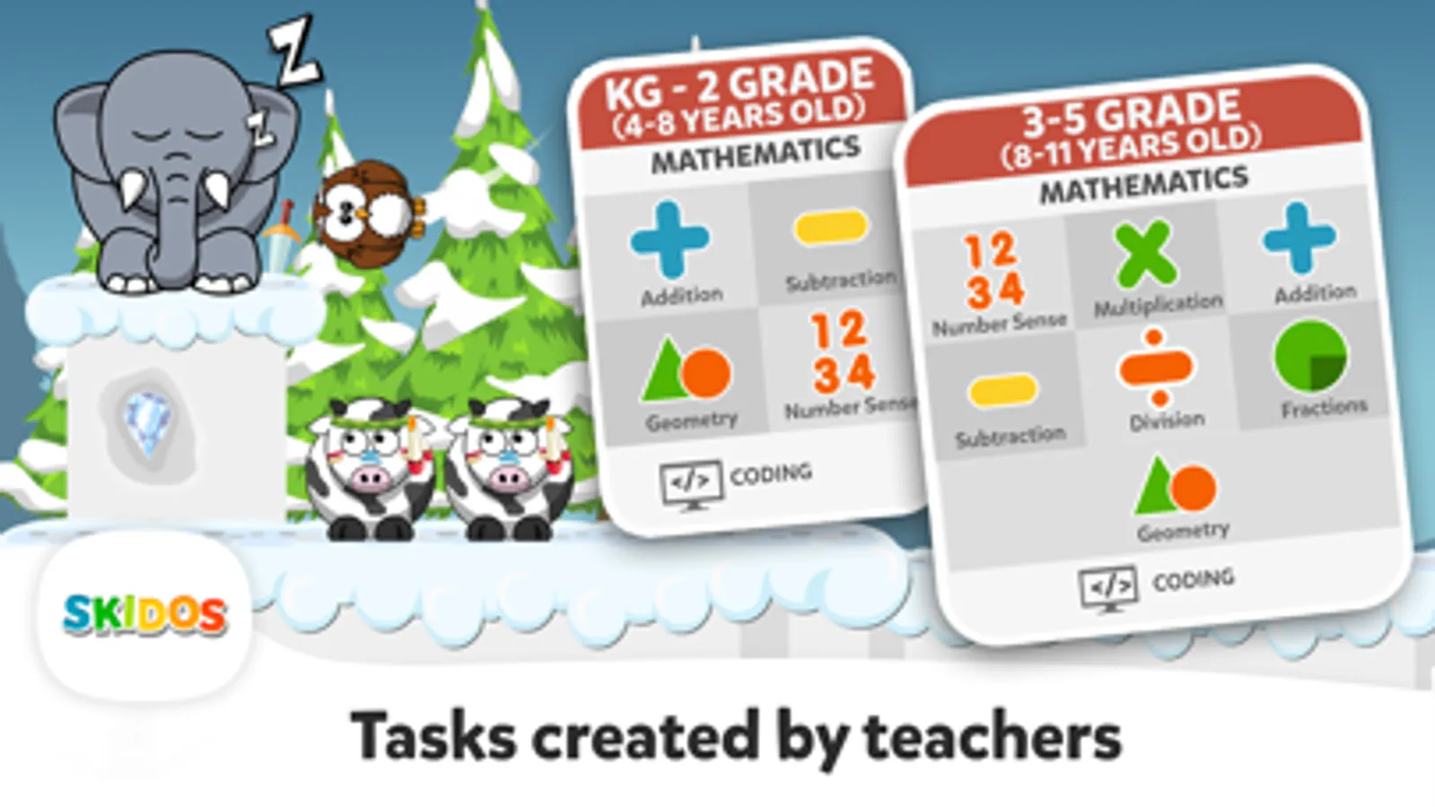 MATH: Our math exercises cover a comprehensive list of topics, including number sense, addition, subtraction, multiplication, division, geometry, and more. Tasks evolve as your child progresses. Interactive design and animations help support learning - three cute SKIDOS mascots will offer assistance, encouraging kids while they work on the assignments.