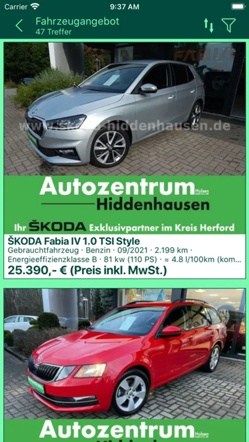 Über das integrierte Fahrzeugangebot können Sie auch außerhalb der Öffnungszeiten sämtliche Infos zu unseren Fahrzeugen abrufen: Einfach die App starten, Fahrzeuge öffnen und alle Informationen rund um das Auto direkt auf das Smartphone bekommen. Mit der Sharing-Funktion können Sie Freunde und Bekannte über Ihren geplanten Kauf informieren und Tipps einholen. Wenn Ihnen das Fahrzeug gefällt, können Sie es direkt auf Ihrer Favoritenliste speichern.