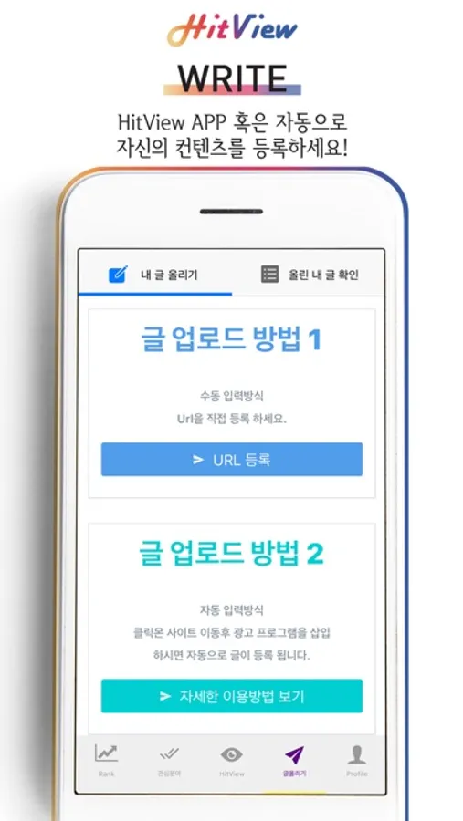HitView App을 통해 직접 글을 등록하거나, 클릭몬의 광고 프로그램을 삽입하여 자동으로 글을 등록할 수 있습니다.