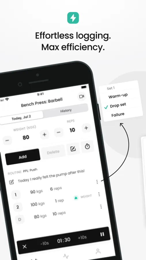 • Mark sets as warm-up, drop sets or failure for advance tracking