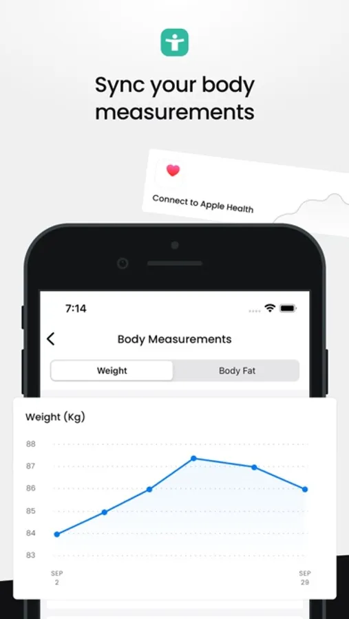• Sync with Apple Health in order to track your weight and body fat percentage