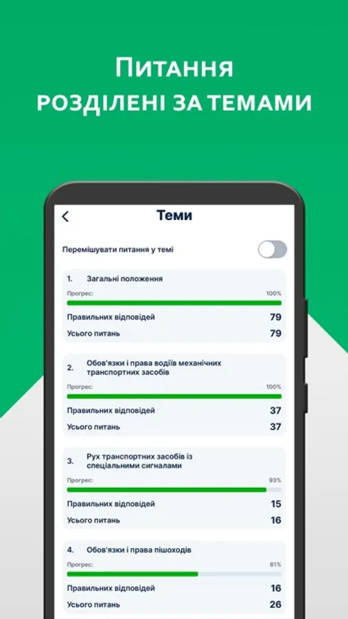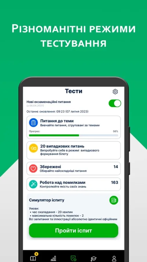 • Щоденне оновлення бази питань з офіційного реєстру питань МВС (НАІС). Щойно з'являються оновлення в державній базі, вони відразу відображаються в нашому додатку.