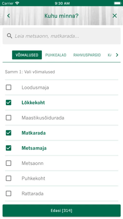 - RMK külastusobjektide liigist, piirkonnast ja kasutaja asukohast lähtuva otsingu