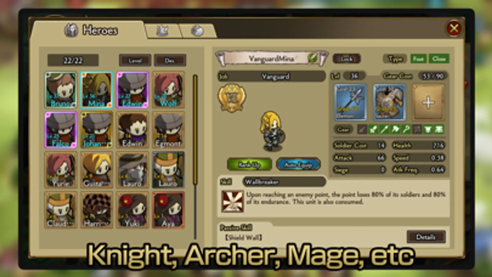 Not only does the game offer short recreational battles, it is also bolstered by aspects from simulation games, as players can spend their time gradually developing their territory. The player, who is a lord of this medieval fantasy world, must recruit many heroes and seek to make their name known across the land.