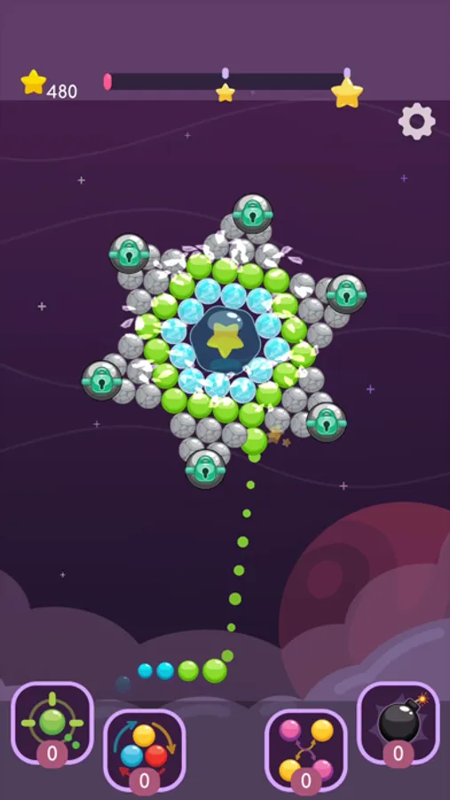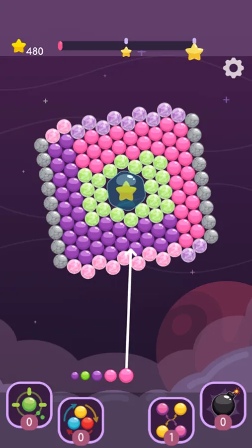 In each level you must clear all bubbles in order to hit the glass in the middle.