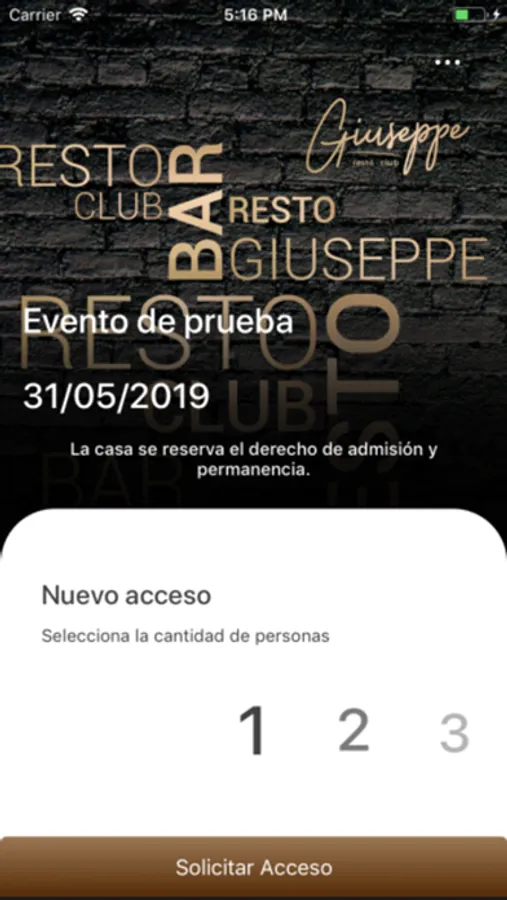 Aplicación para solicitar acceso a Giuseppe Caucete - San Juan - Argentina. Selecioná la cantidad de amigos que van a ingresar y el relación pública que te recomendó el lugar, luego con el código QR disfruta de los beneficios notificados por nuestras redes sociales y relaciones públicas.