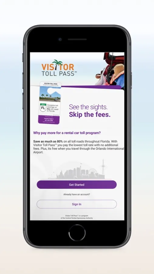 Visitor Toll Pass is a free, temporary toll pass for rental car customers traveling roundtrip through the Orlando International Airport. Simply download the app to reserve Visitor Toll Pass and save as much as 80% on tolls by skipping costly rental car toll fees while paying the lowest toll rate throughout Florida.
