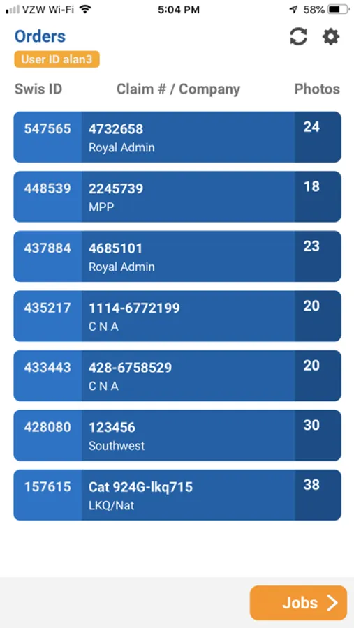 The app contacts the SWIS servers to get a list of open orders for you as the inspector. After you login and the list is acquired, you tap on an order to start taking pictures for the order. You can also use pictures that you have taken prior to using the app by selecting them from the camera roll. During the photo session you may add comments, rotate or delete individual photos in the photo save window. When the photo session is complete, you are directed to the jobs screen and a job is created that must be uploaded to the server. When the job is tapped on the jobs screen, the app uploads the pictures to the SWIS website and associates them with the order. If you opted to allow the app to use the camera roll, the photos must be deleted manually from the your "Photos" app.