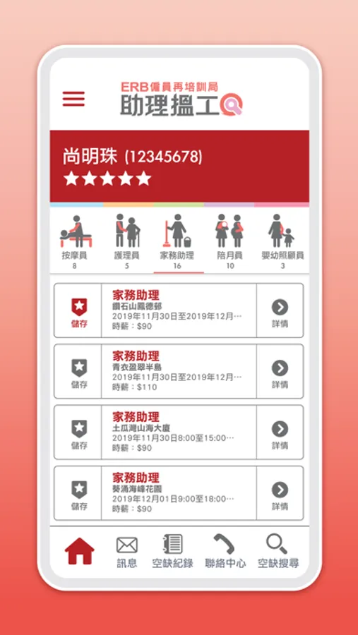 • 接收訊息(如獲僱主揀選,系統會即時向助理發出通知,雙方可以直接聯絡,商討工作安排)