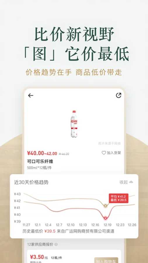 “货比三价”收录一万+进货渠道的商品。电商包括1688阿里巴巴批发网、大润发e路发、快来掌柜、拼便宜、美菜、海拍客、阿里零售通、京东掌柜宝、美团快驴进货、易订货宝365、1919酒类直供、酒仙网、便利宝、易久批、冻品在线、有菜、惠配通等等。超1万家批发部、经销代理商等纷纷入驻。万家商户齐助阵,货比三价,比出低价。