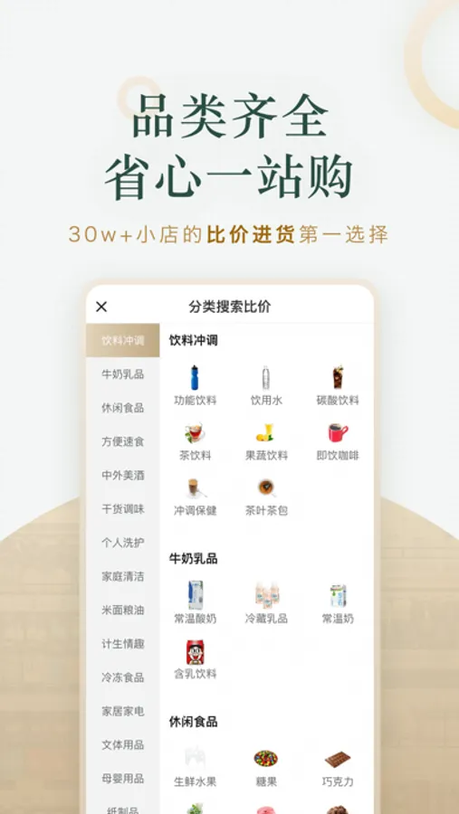 商品齐全,包括母婴、日用百货,饮料、酒水,零食、小吃,米面、粮油,干货调味,家居用品,美容护肤等,完全满足超市便利店的进货需求。