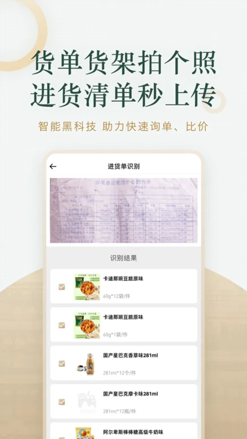 支持多种搜索方式比价,包括扫码比价、拍进货单比价、拍货架比价四种比价方式。比价“黑科技”,3秒找到最低价。